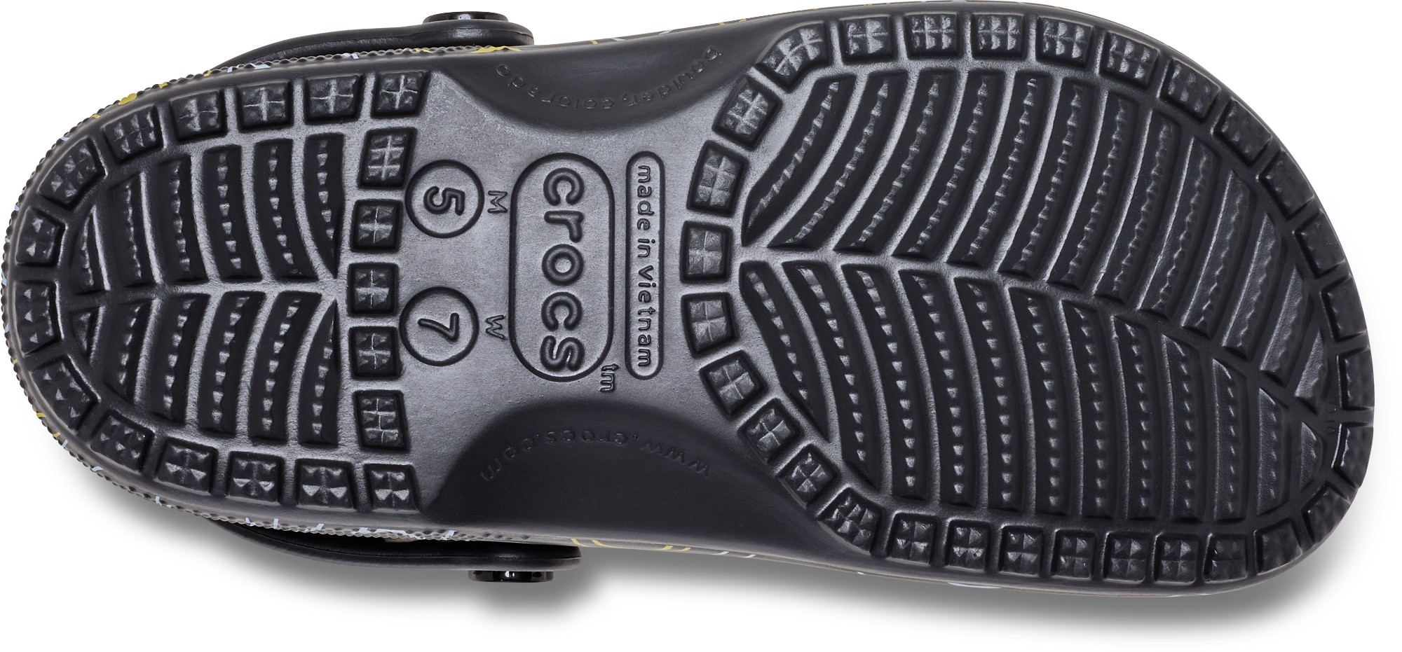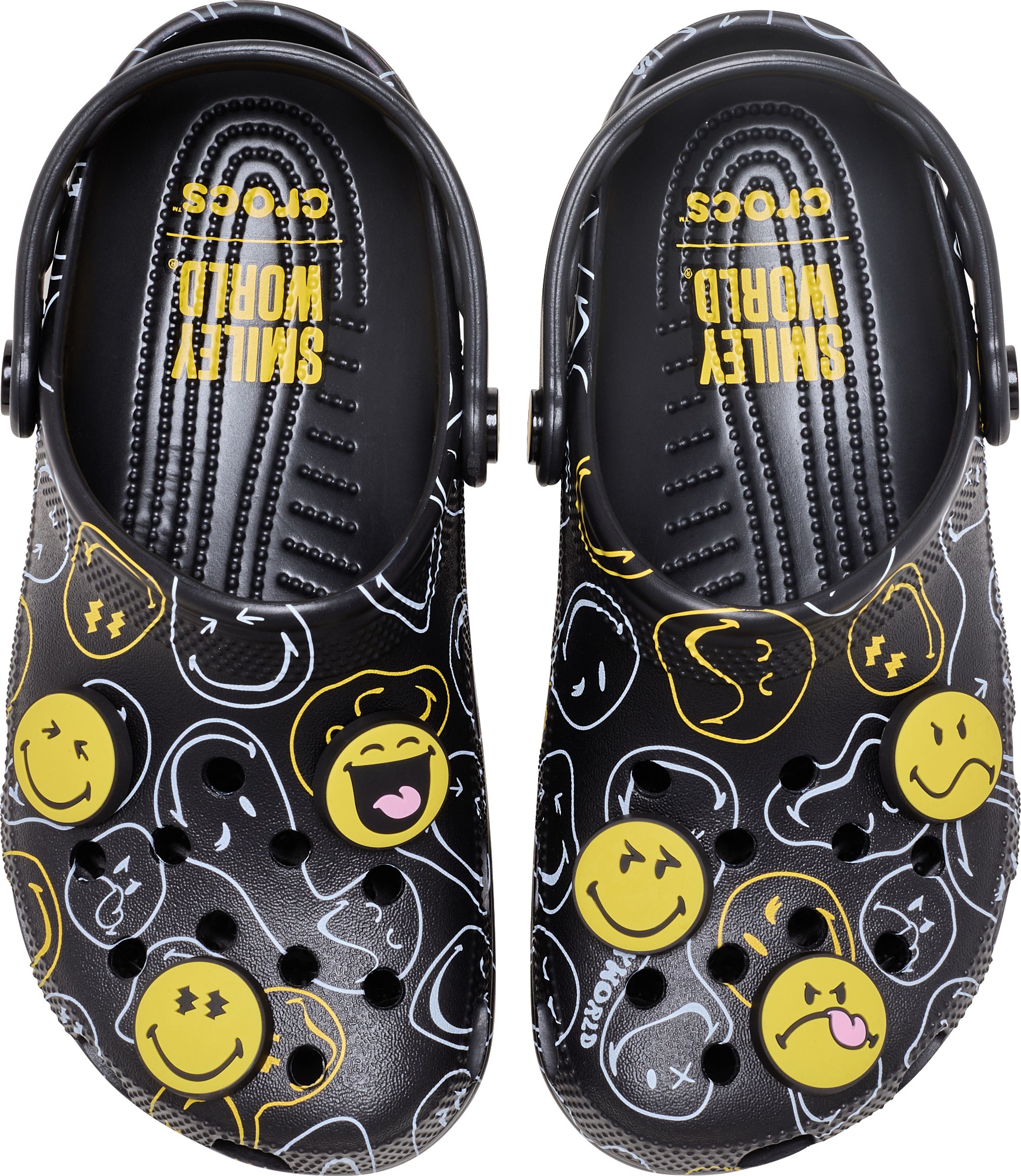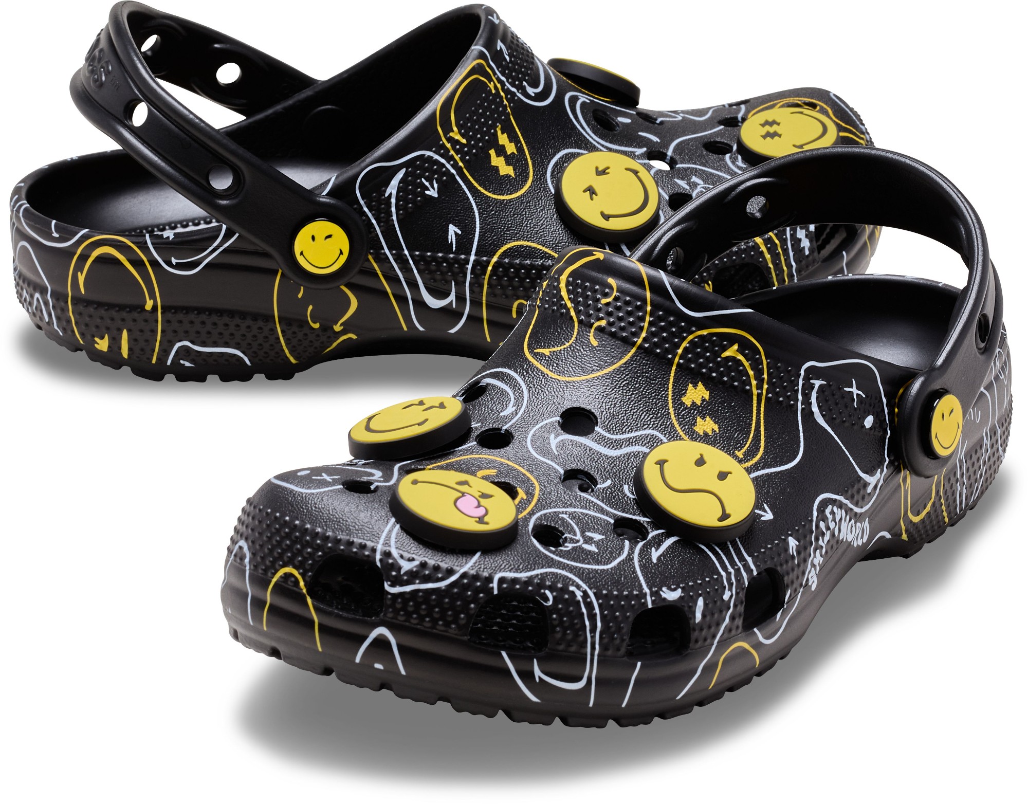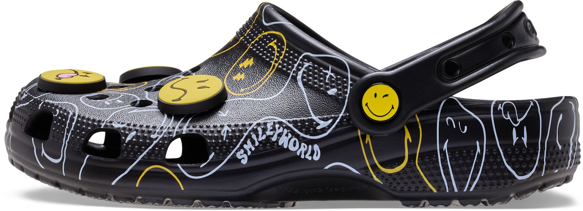 Wear your joy wherever you go in the SmileyWorld® Classic Clog, a playful pair that will have you grinning ear to ear. A comfy Croslite™ sole supports an upper that features an all-over SmileyWorld graphic print and comes pre-loaded with a fun collection of Jibbitz™ charms. Additional room on each shoe allows you to add even more personalization depending on your mood. Dial up the smiles in a style that's sure to be your new favorite.
