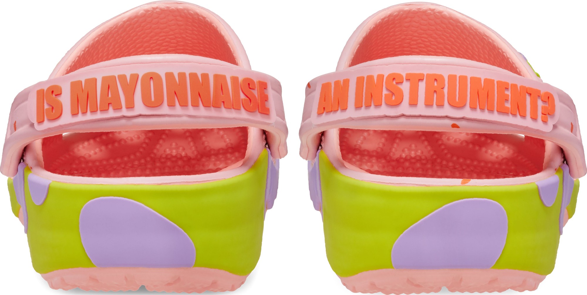 Dive into the world of Bikini Bottom with the Patrick Classic Clog! This exclusive design features iconic Patrick Star printed graphics to add a splash of personality, with themed Jibbitz™ charms to complete the look. The backstraps feature text asking the classic question, “Is mayonnaise an instrument?